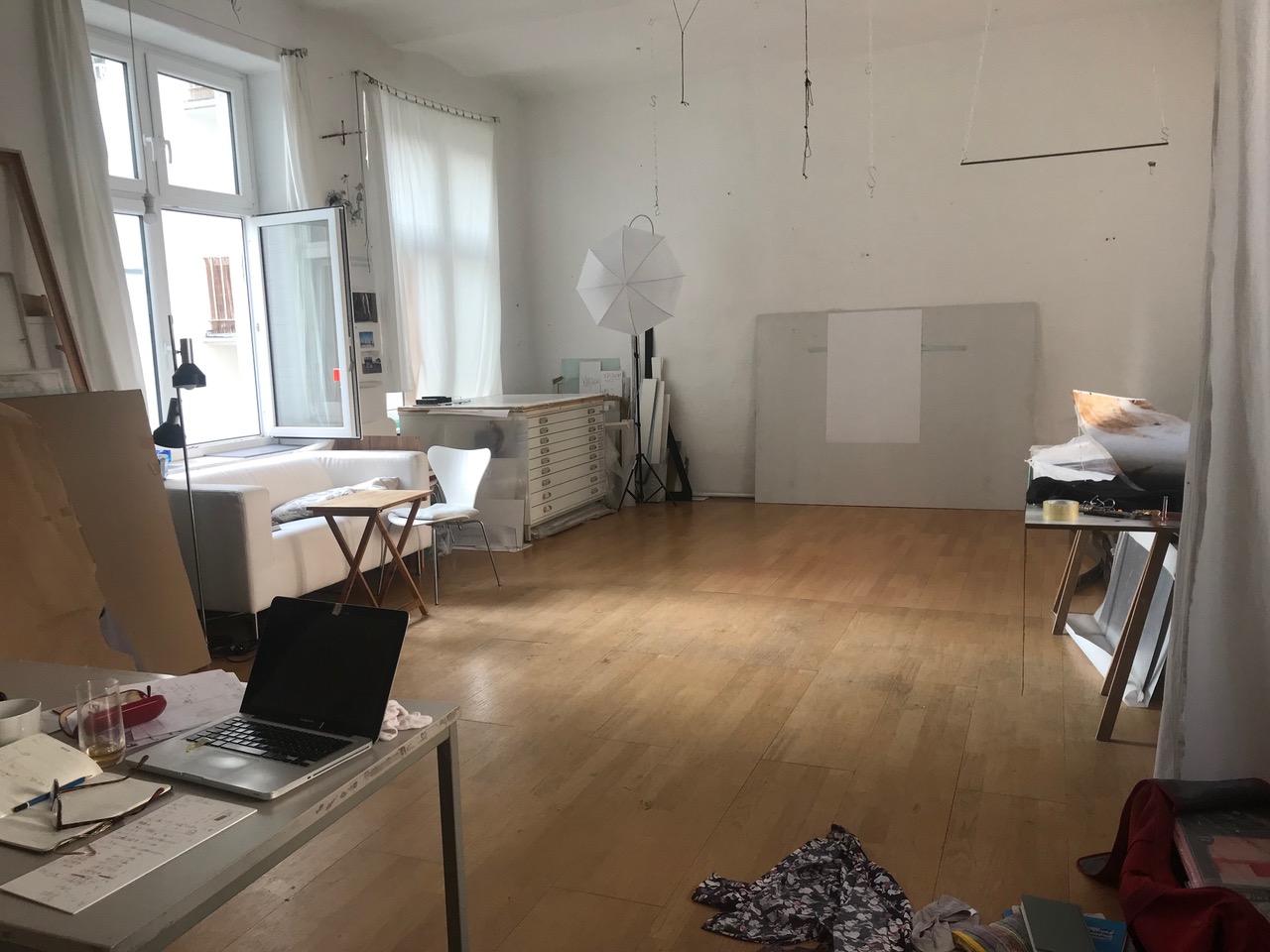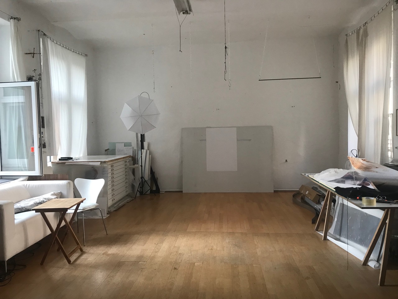 In einem ca. 70 m² großen Atelier in Frankfurt-Sachsenhausen wird der vordere, helle ca. 48 m² große Bereich mit großen Fenstern vermietet.